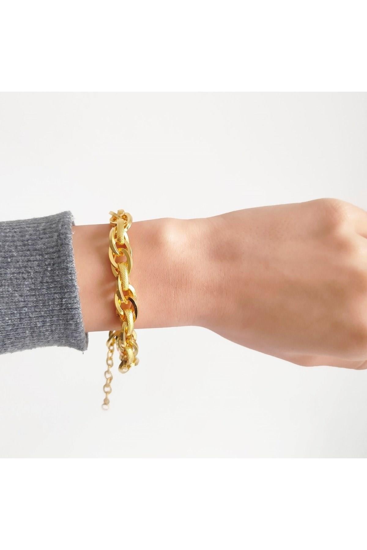 Altın kaplama bileklik formundaki bu özel tasarım, parlak yüzeyiyle klasik altın görünümünü uzun süre koruyarak bilekte şık ve dikkat çekici bir duruş sunar.