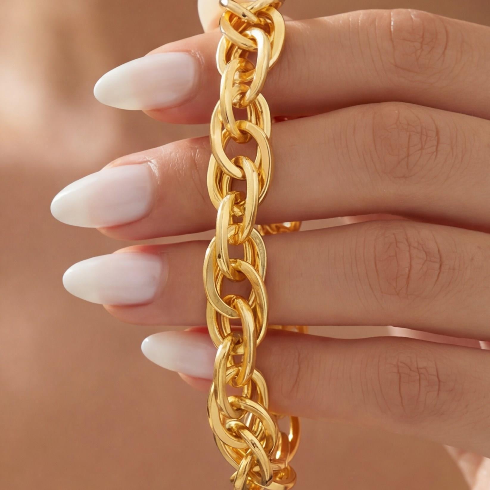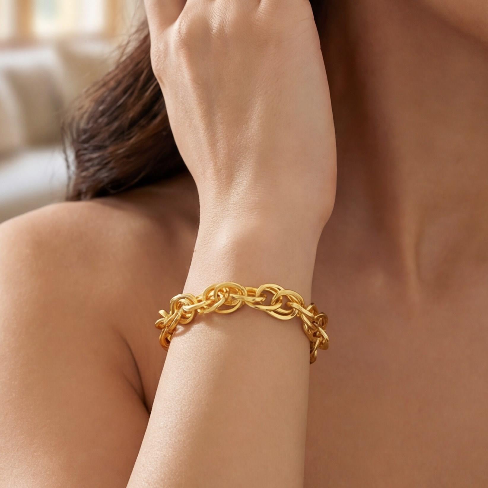 Altın kaplama Samanyolu bileklik formundaki bu özel tasarım, taşlı ve parlak detaylarıyla bilekte ışıl ışıl bir görünüm oluşturarak şık kombinleri tamamlar.