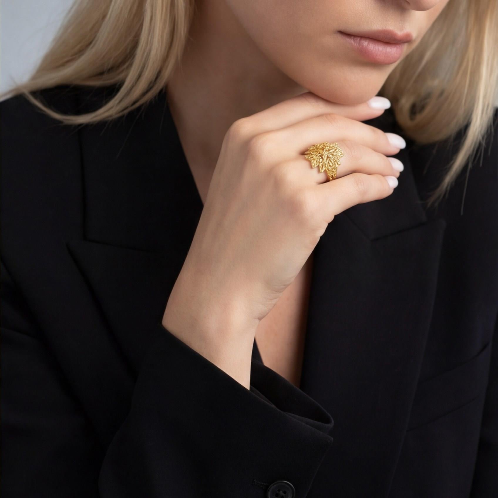 Altın kaplama yüzük formundaki bu özel tasarım, parlak yüzeyiyle elde şık bir görünüm oluşturarak klasik altın zarafetini yansıtır.