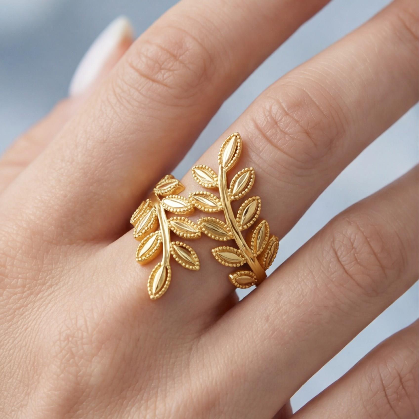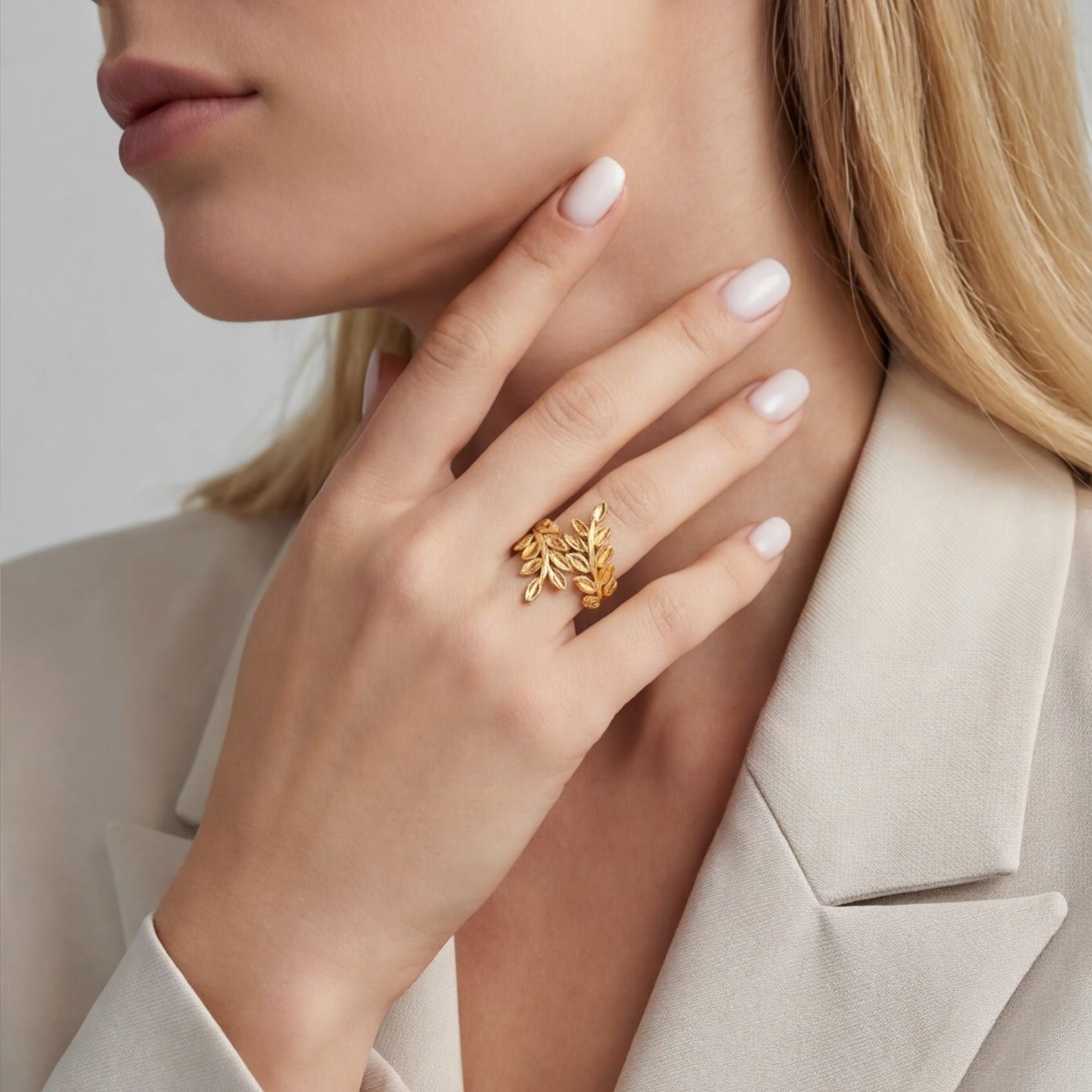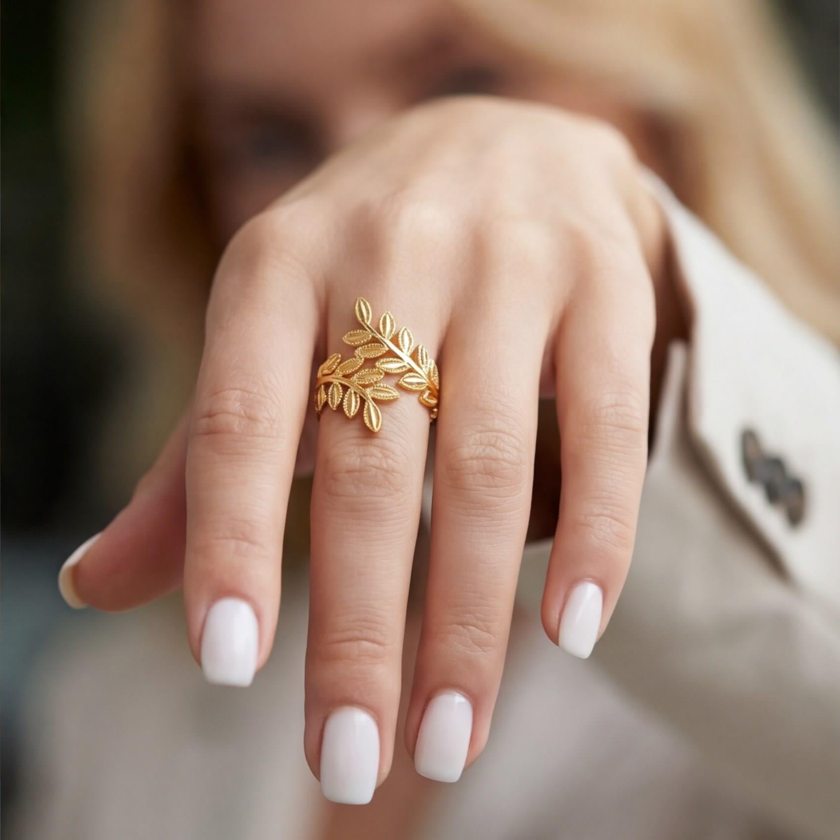 Altın kaplama yüzük formundaki bu özel tasarım, parlak yüzeyiyle elde şık bir görünüm oluşturarak klasik altın zarafetini yansıtır.