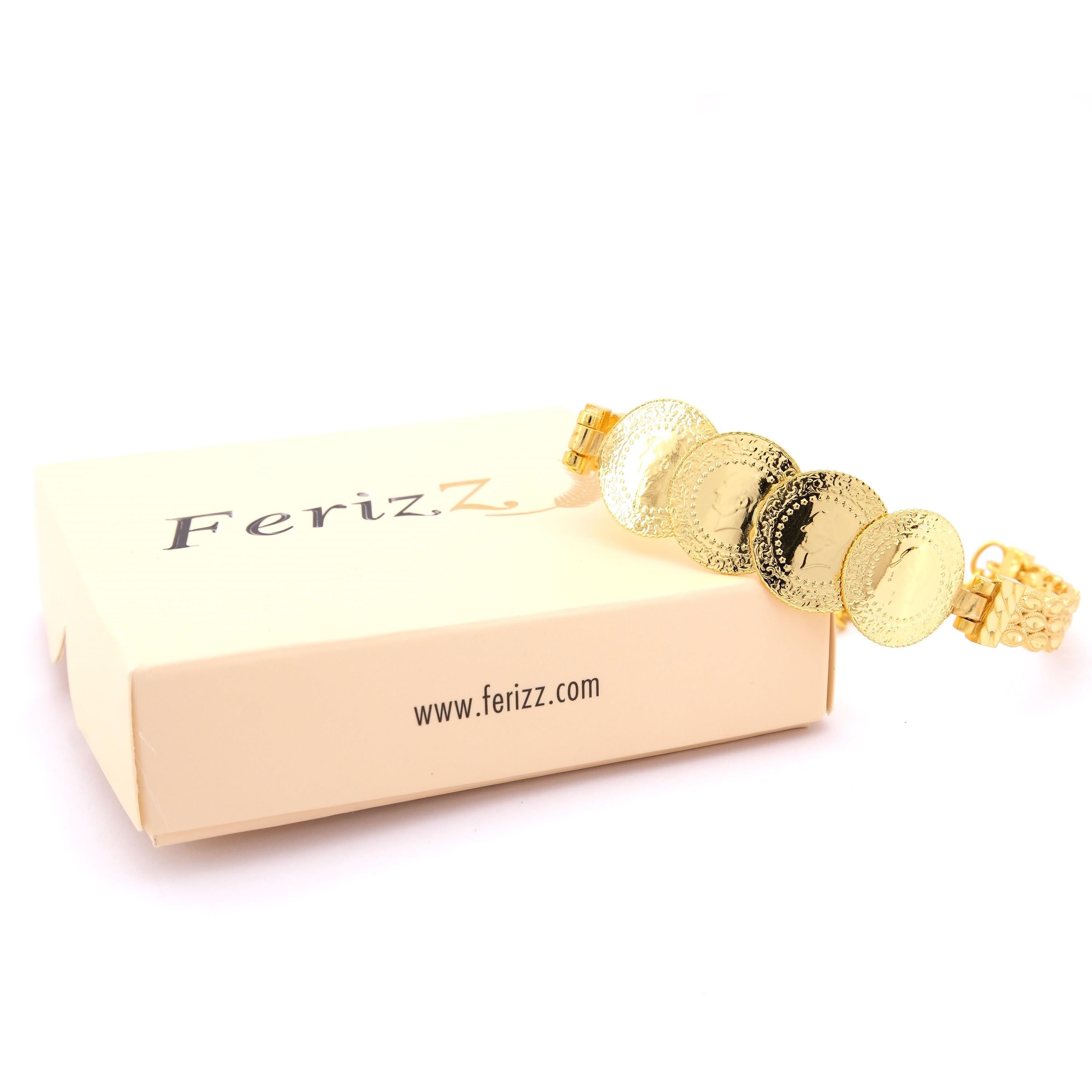 Altın kaplama bileklik formundaki bu özel tasarım, parlak yüzeyiyle klasik altın görünümünü uzun süre koruyarak bilekte şık ve dikkat çekici bir duruş sunar.