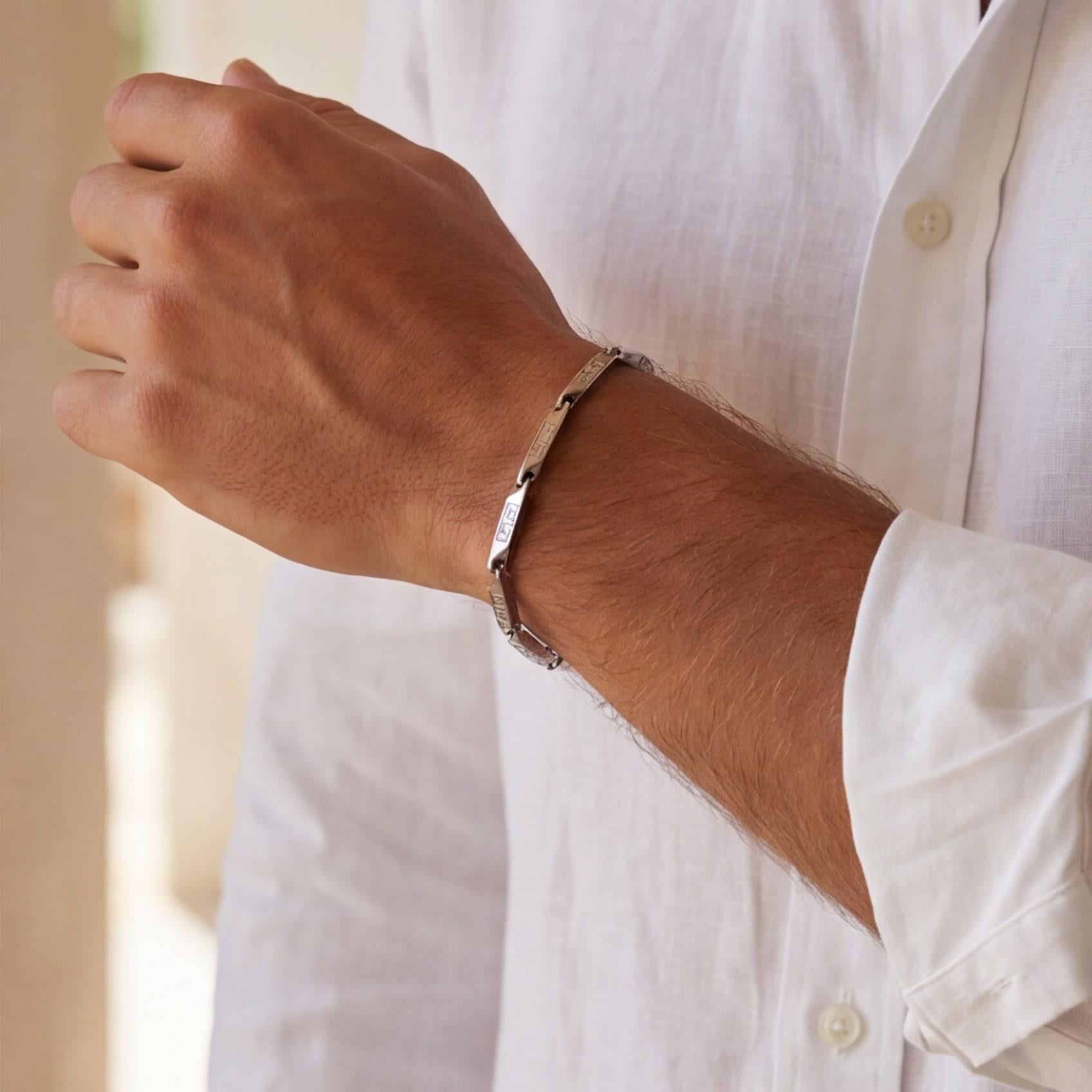Çelik bileklik formundaki bu özel tasarım, sağlam yapısıyla metal parlaklığını uzun süre koruyarak bilekte modern bir duruş sunar.