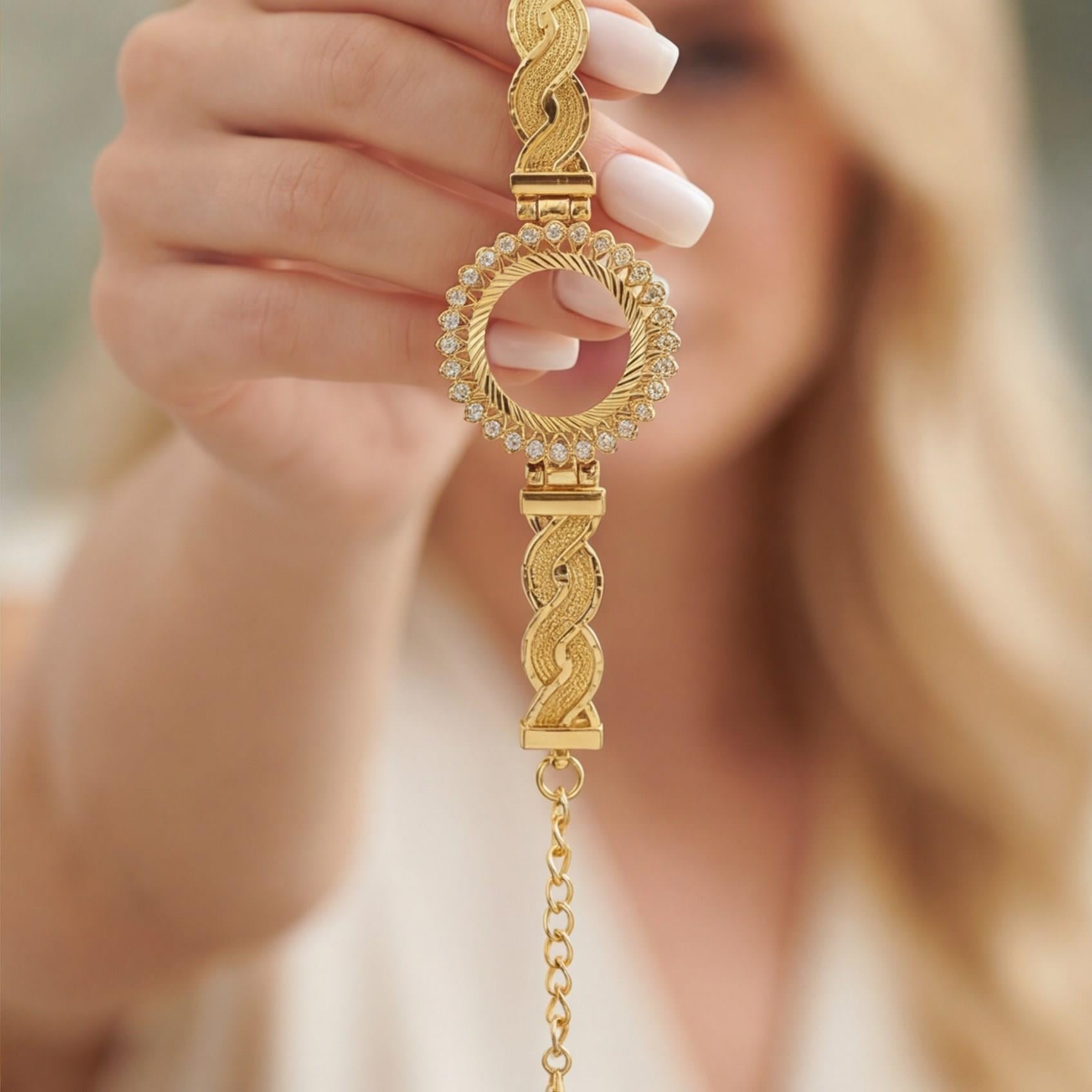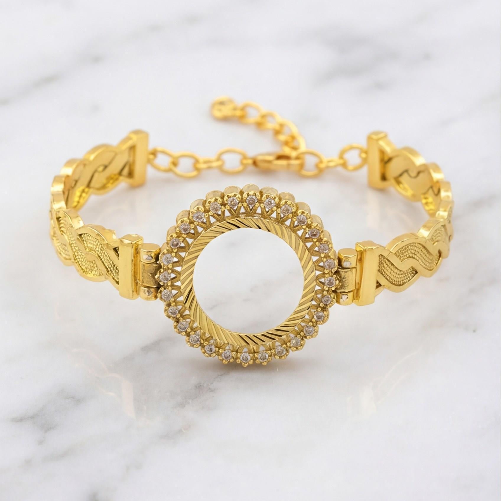 Altın kaplama çeyrek altın çerçeve bileklik, çeyrek altın takılması için tasarlanmış özel formu sayesinde bilekte klasik ve dikkat çekici bir görünüm sunar. Parlak altın tonu ve dengeli yapısıyla günlük kullanımdan özel gün kombinlerine kadar farklı stillerle kolayca uyum sağlar.
