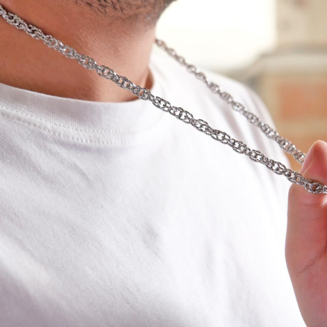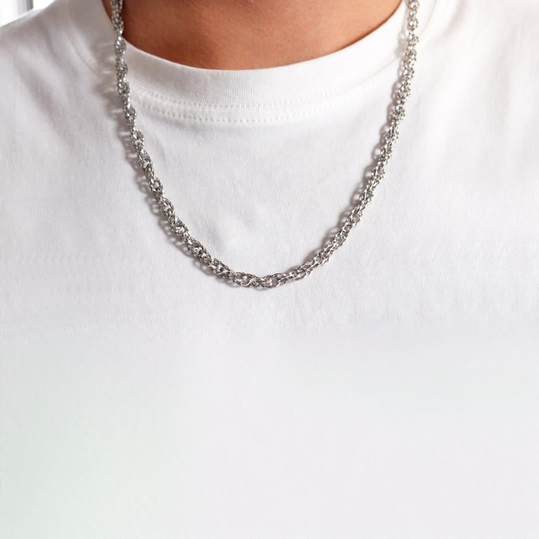 Çelik zincir kolye formundaki bu özel tasarım, pürüzsüz metal yapısıyla parlak görünümünü uzun süre koruyarak güçlü ve modern bir stil sunar.