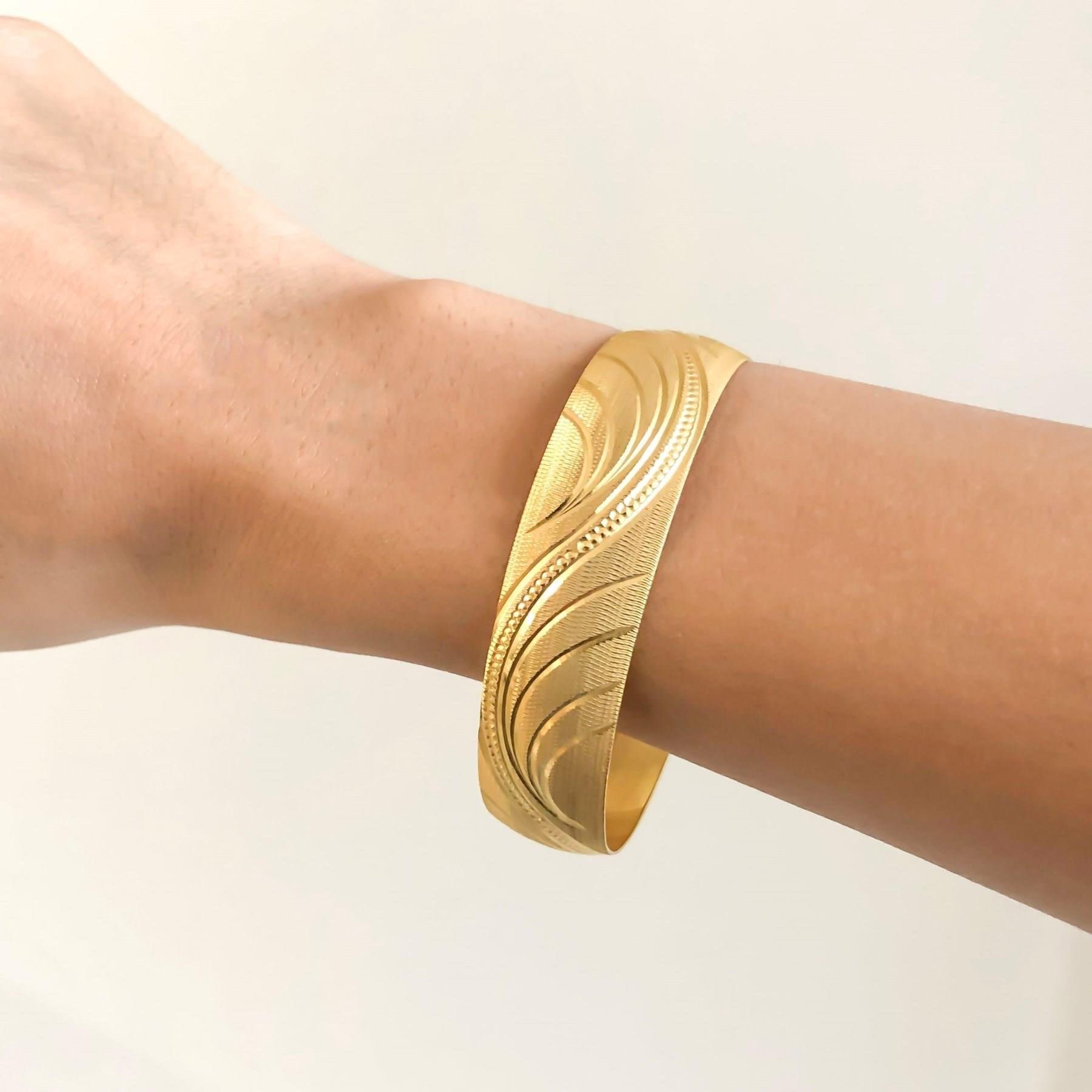 Altın kaplama bilezik formundaki bu özel tasarım, parlak yüzeyiyle geleneksel altın şıklığını uzun süre koruyarak güçlü bir stil sunar.