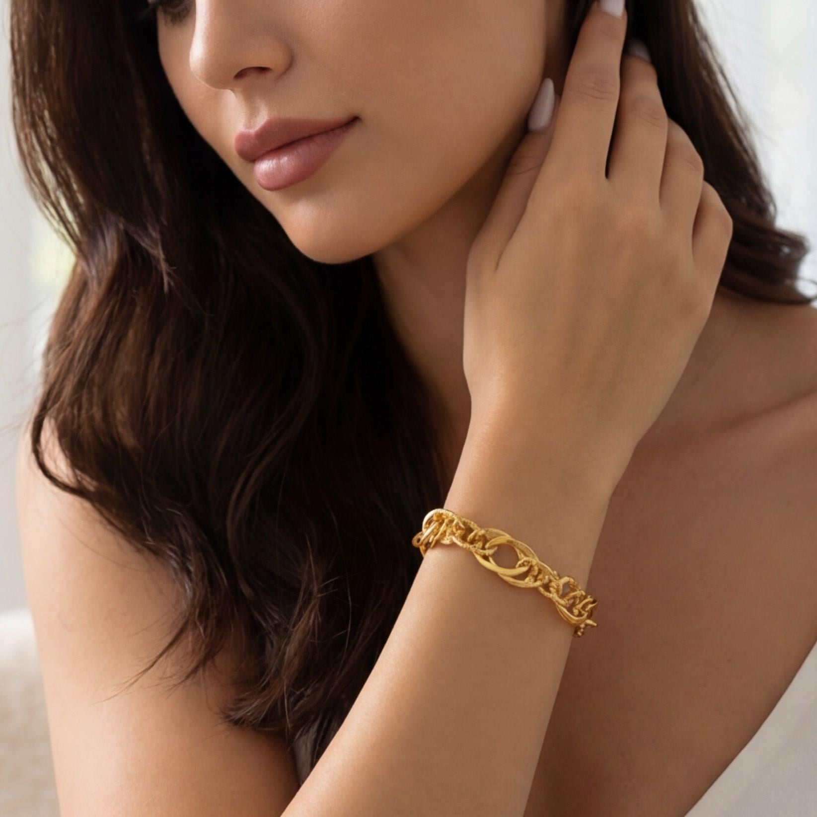 Altın kaplama Samanyolu bileklik formundaki bu özel tasarım, taşlı ve parlak detaylarıyla bilekte ışıl ışıl bir görünüm oluşturarak şık kombinleri tamamlar.