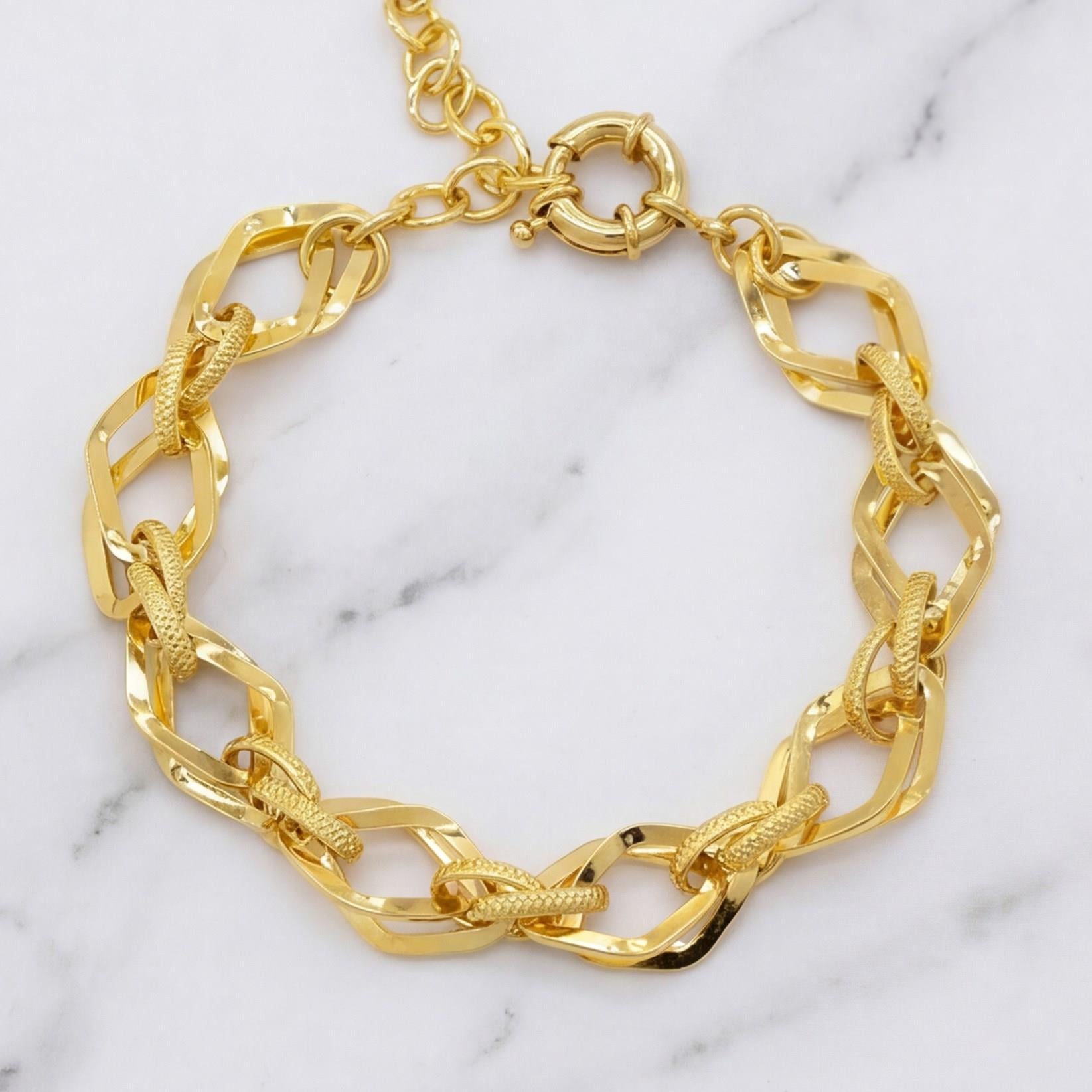 Altın kaplama Samanyolu bileklik formundaki bu özel tasarım, taşlı ve parlak detaylarıyla bilekte ışıl ışıl bir görünüm oluşturarak şık kombinleri tamamlar.