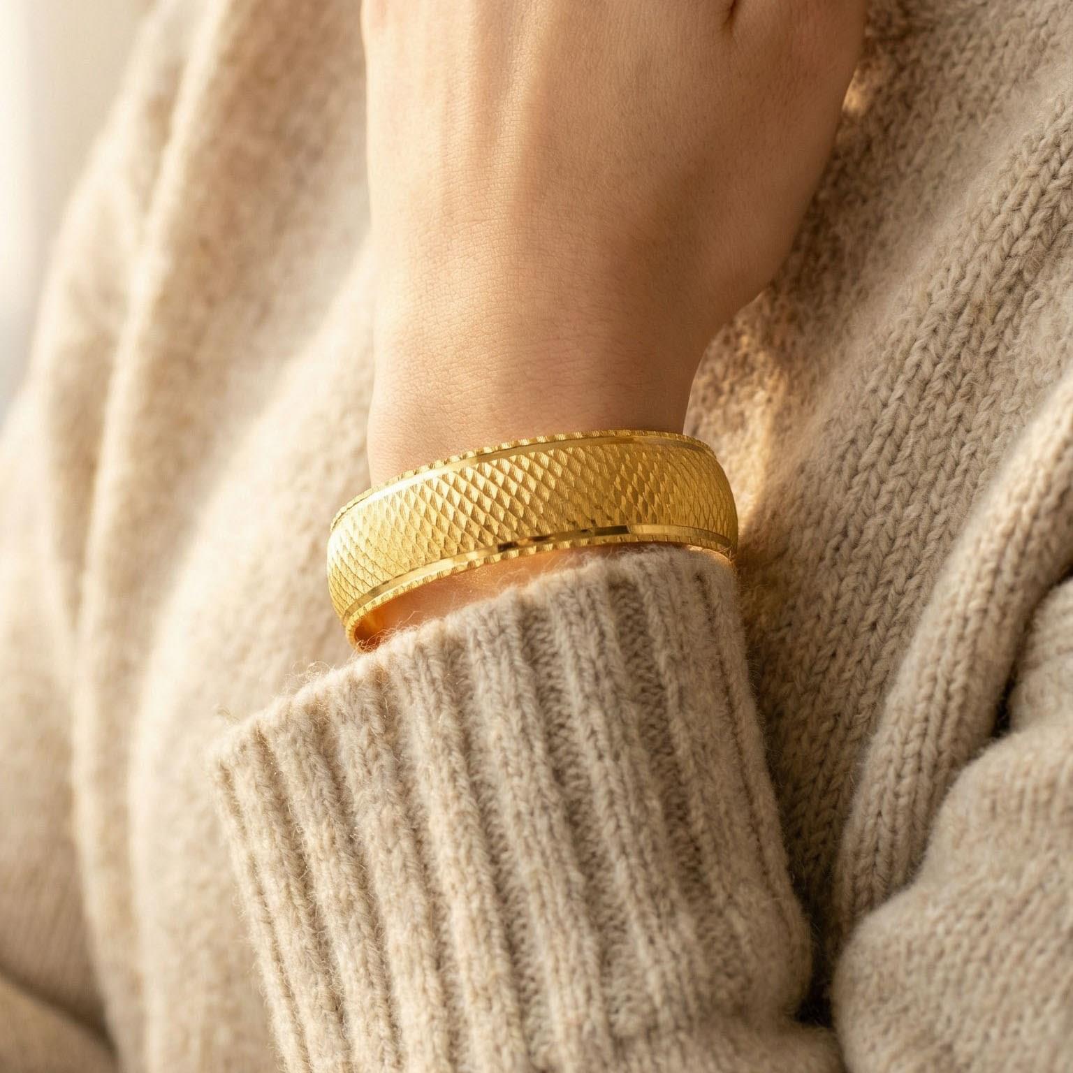 Altın kaplama bilezik formundaki bu özel tasarım, parlak yüzeyiyle geleneksel altın şıklığını uzun süre koruyarak güçlü bir stil sunar.