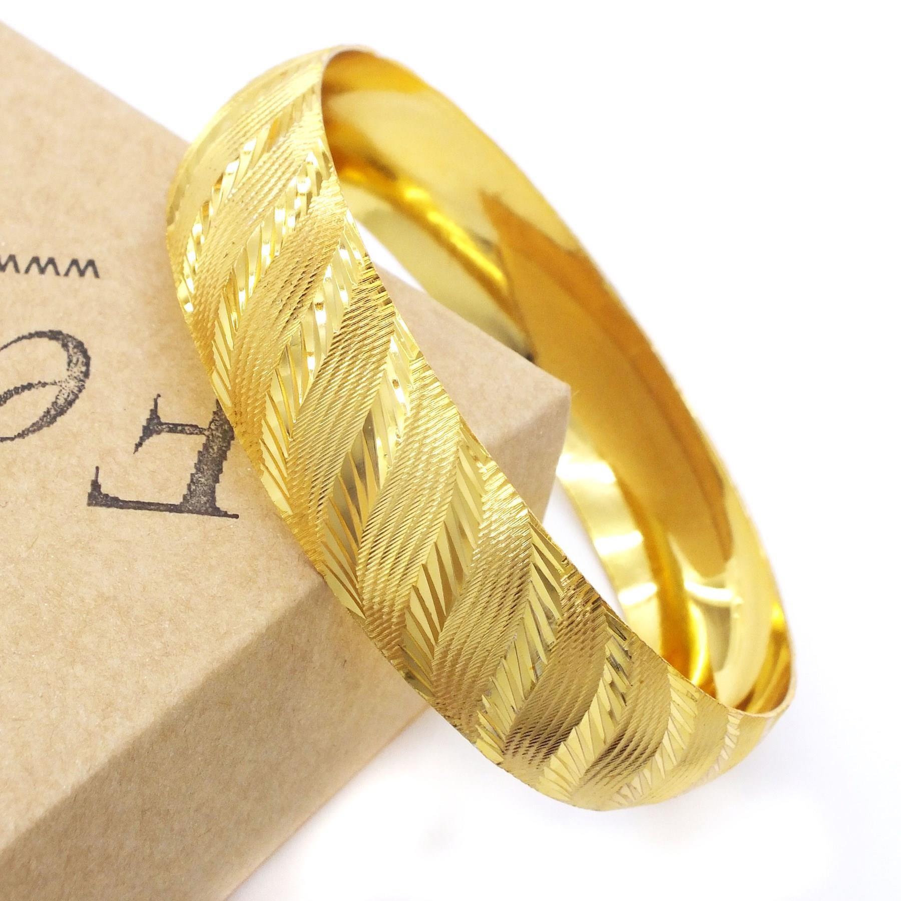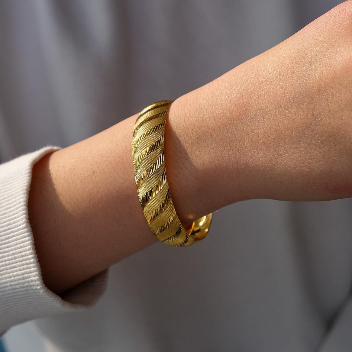 Altın kaplama bilezik formundaki bu özel tasarım, parlak yüzeyiyle geleneksel altın şıklığını uzun süre koruyarak güçlü bir stil sunar.