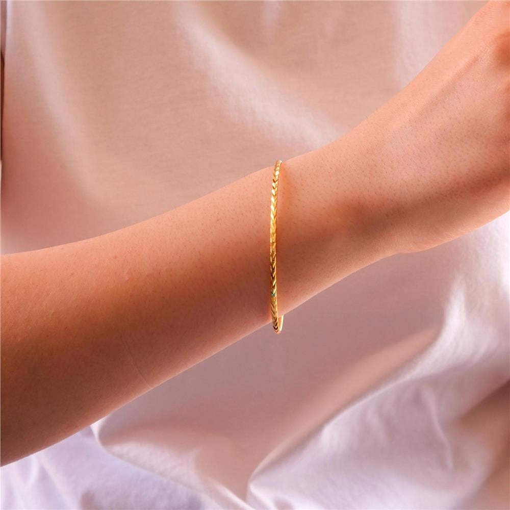 Altın kaplama ajda bilezik formundaki bu özel tasarım, ince ve parlak yapısıyla bilekte zarif bir altın görünümü sunarak klasik şıklığı yansıtır.