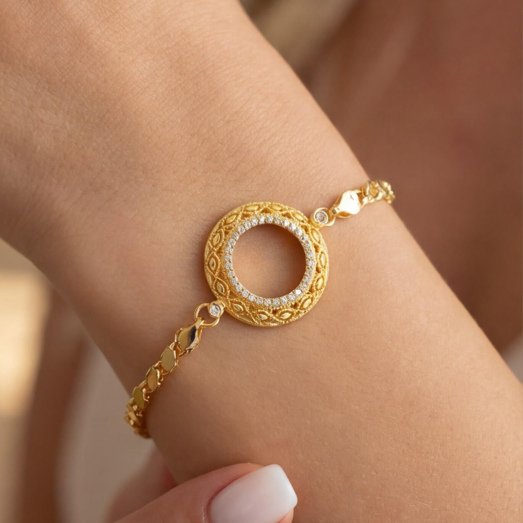 İmitasyon çeyrek çerçeve bileklik formundaki bu özel tasarım, 22 ayar altın kaplama rengiyle klasik çeyrek görünümünü modern bir bileklik formunda sunarak bilekte dikkat çekici ve şık bir duruş oluşturur. Çerçeveli detay yapısı sayesinde tek başına güçlü bir görünüm verirken günlük kombinlerden özel anlara kadar kolayca uyum sağlar.