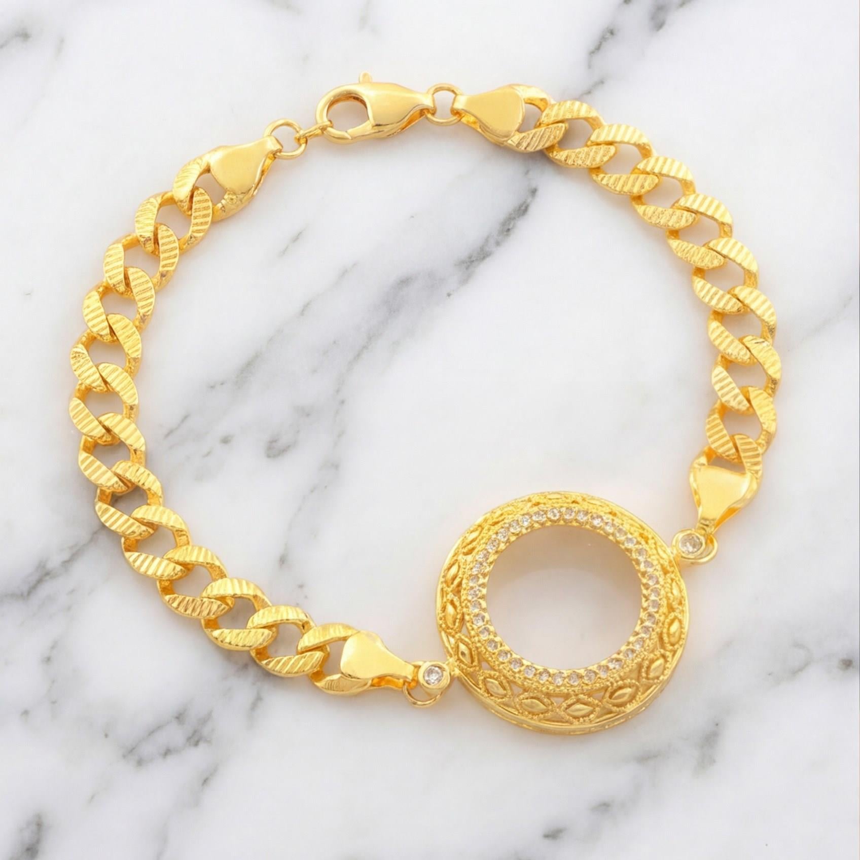 Altın kaplama çeyrek altın çerçeve bileklik, çeyrek altın takılması için tasarlanmış özel formu sayesinde bilekte klasik ve dikkat çekici bir görünüm sunar. Parlak altın tonu ve dengeli yapısıyla günlük kullanımdan özel gün kombinlerine kadar farklı stillerle kolayca uyum sağlar.