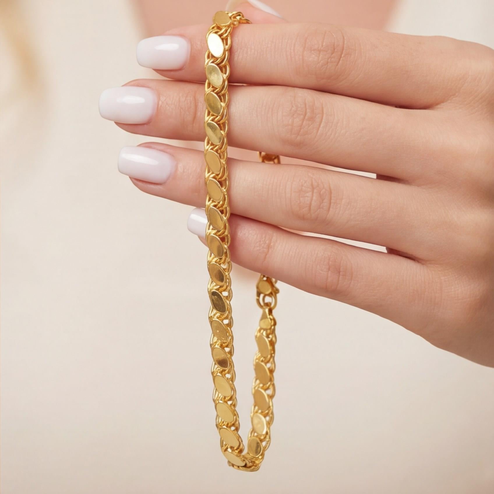 Altın kaplama bileklik formundaki bu özel tasarım, parlak yüzeyiyle klasik altın görünümünü uzun süre koruyarak bilekte şık ve dikkat çekici bir duruş sunar.