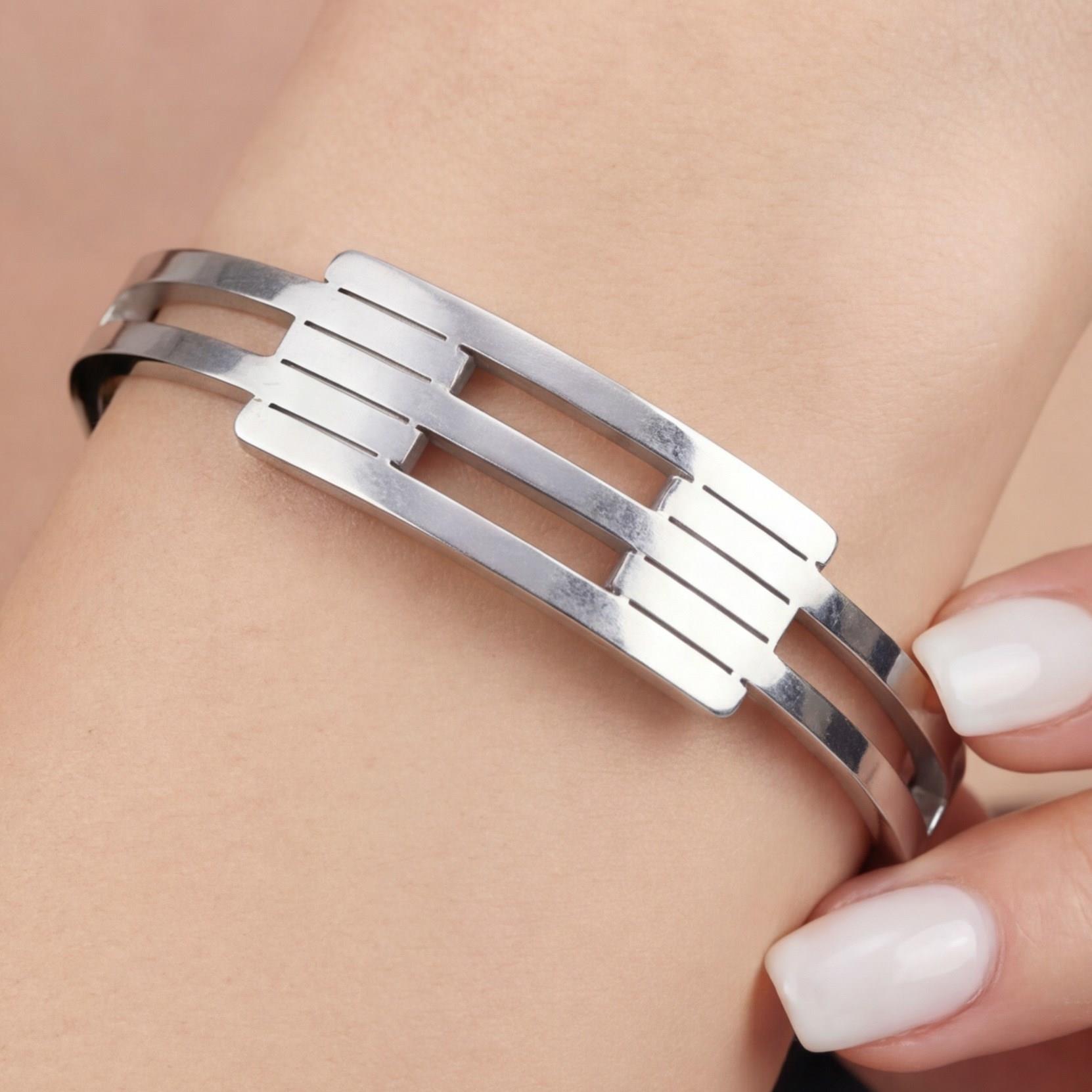 Çelik bileklik formundaki bu özel tasarım, sağlam yapısıyla metal parlaklığını uzun süre koruyarak bilekte modern bir duruş sunar.