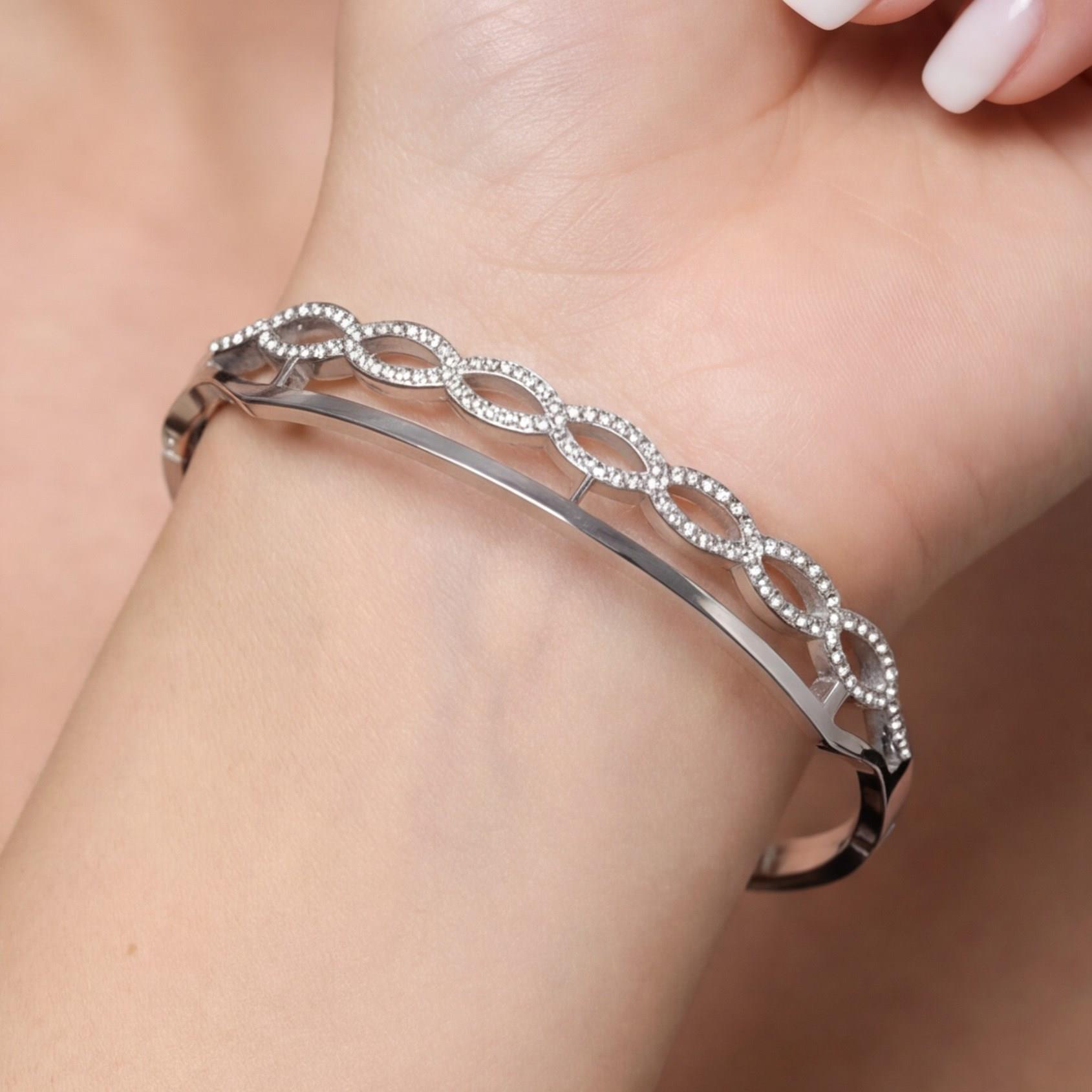 Çelik bileklik formundaki bu özel tasarım, sağlam yapısıyla metal parlaklığını uzun süre koruyarak bilekte modern bir duruş sunar.