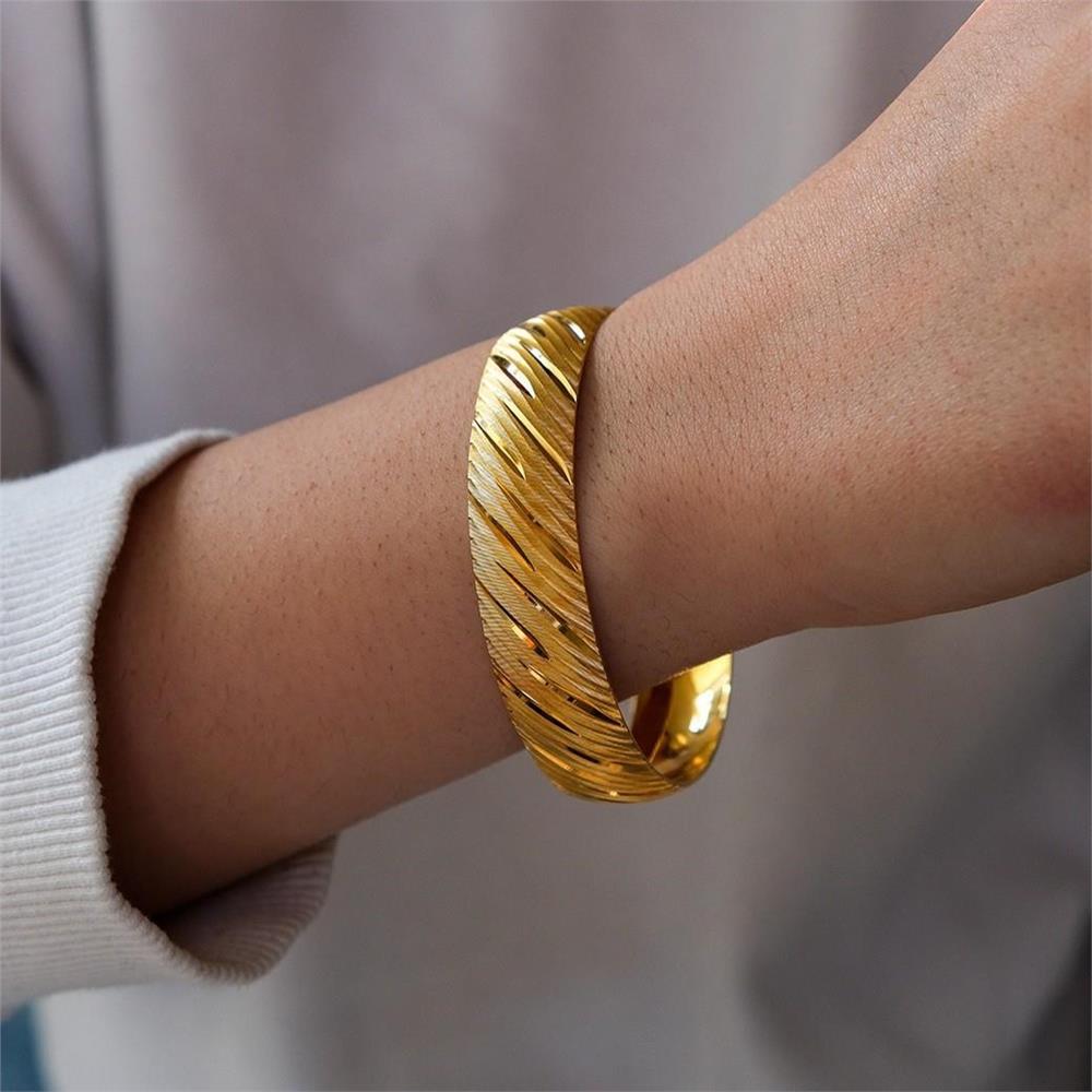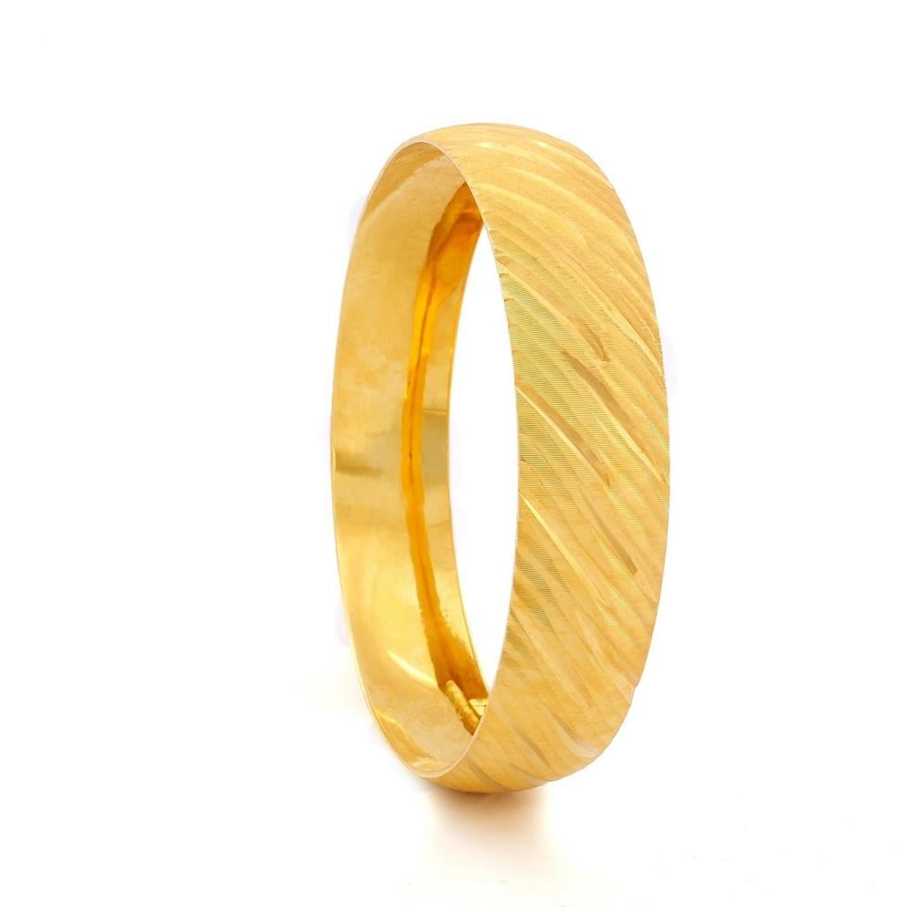 Altın kaplama bilezik formundaki bu özel tasarım, parlak yüzeyiyle geleneksel altın şıklığını uzun süre koruyarak güçlü bir stil sunar.