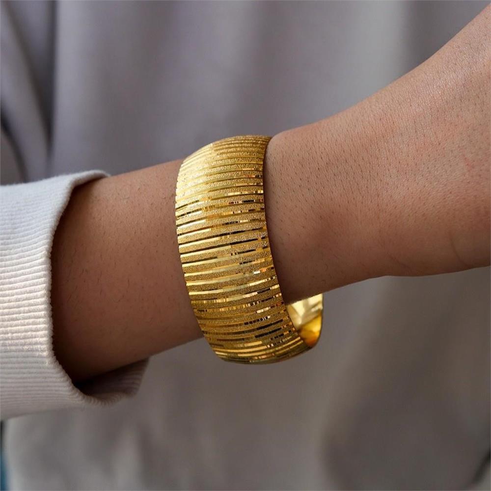 Altın kaplama bilezik formundaki bu özel tasarım, parlak yüzeyiyle geleneksel altın şıklığını uzun süre koruyarak güçlü bir stil sunar.