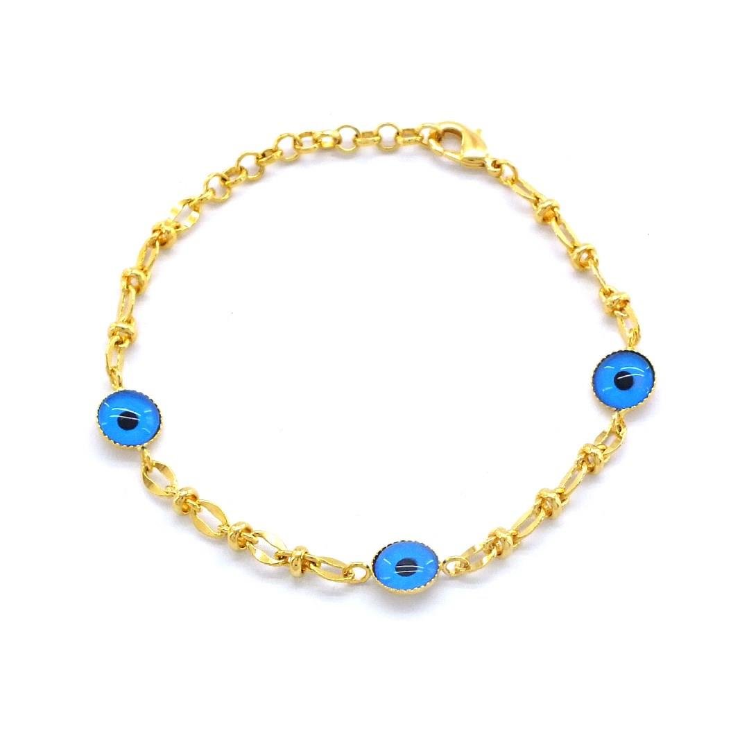 Renk: Parlak altın rengi ve mavi nazar boncuğu detayı, bileziğin zarif ve dikkat çekici detaylarını öne çıkarır