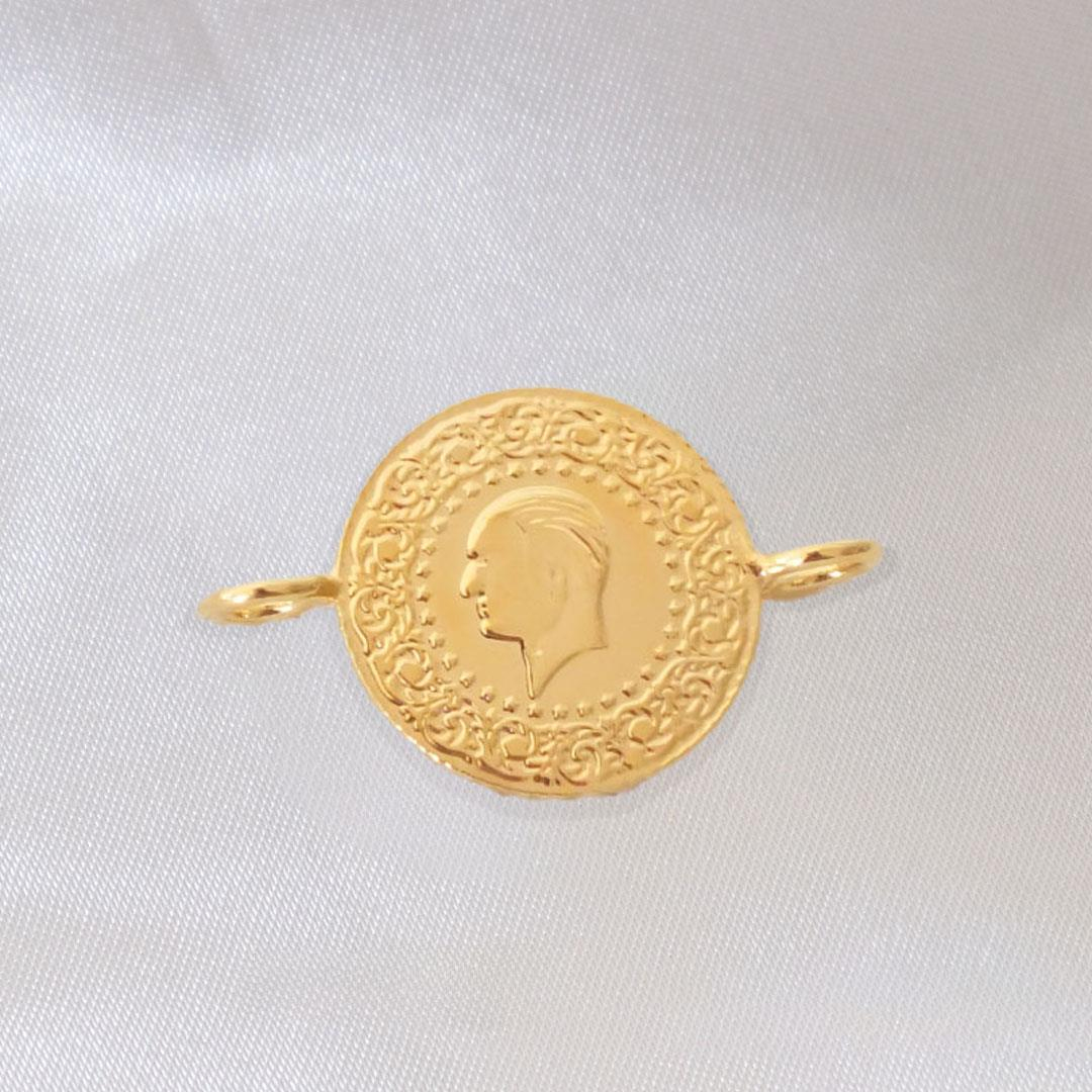 İmitasyon Çift Kulplu Çeyrek Altın, orijinal çeyrek altın görünümünü yansıtan, dekoratif amaçla üretilmiş bir takı ürünüdür. 22 ayar renk tonuna sahip özel alaşım malzemeden yapılmıştır. Çift kulplu tasarımı sayesinde kolye, bileklik veya özel takı tasarımlarında pratik kullanım sunar.